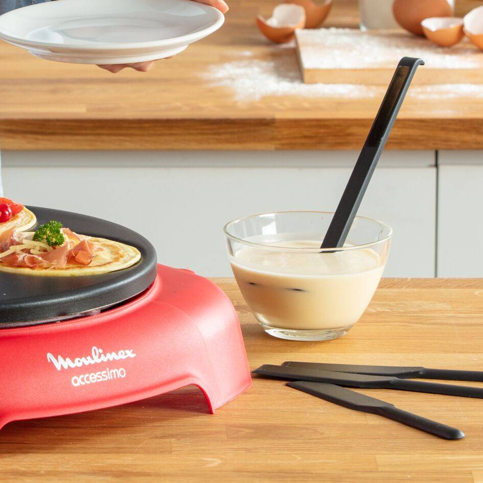 Prepare crepes ao pequeno-almoço ou para o lanche de forma fácil e à mesa com a família e amigos. Com arrumação vertical para ocupar menos espaço na cozinha e 5 acessórios incluídos de fácil arrumação na base do aparelho. Inclui 4 espátulas de madeira e 1 concha para verter o preparado.