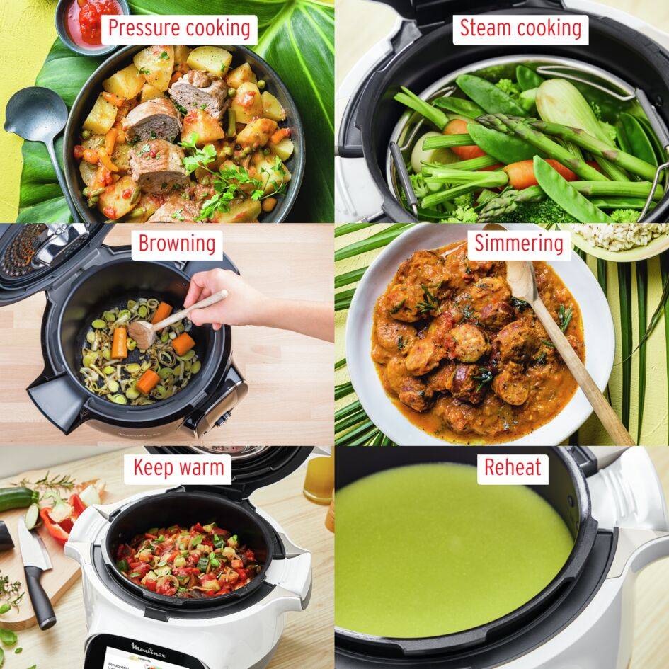 Deixe-se inspirar todos os dias com as 150 receitas disponíveis na Cookeo+. Indicações passo a passo das receitas escritas no ecrã da Cookeo+ para cozinhar com total tranquilidade. Cozinhe rapidamente com o modo panela de pressão, para refeições prontas em pouco tempo. Poupe tempo, ao não ter necessidade de vigiar ou intervir nos cozinhados: a Cookeo controla a confeção por si. 6 Modos: Vapor (vegetais), lume brando (risotto), refugar ou cozedura lenta (carnes, guisados), reaquecer e cozinhar à pressão (refeições rápidas). App exclusiva grátis, para criar o seu próprio livro de receitas e partilhar.