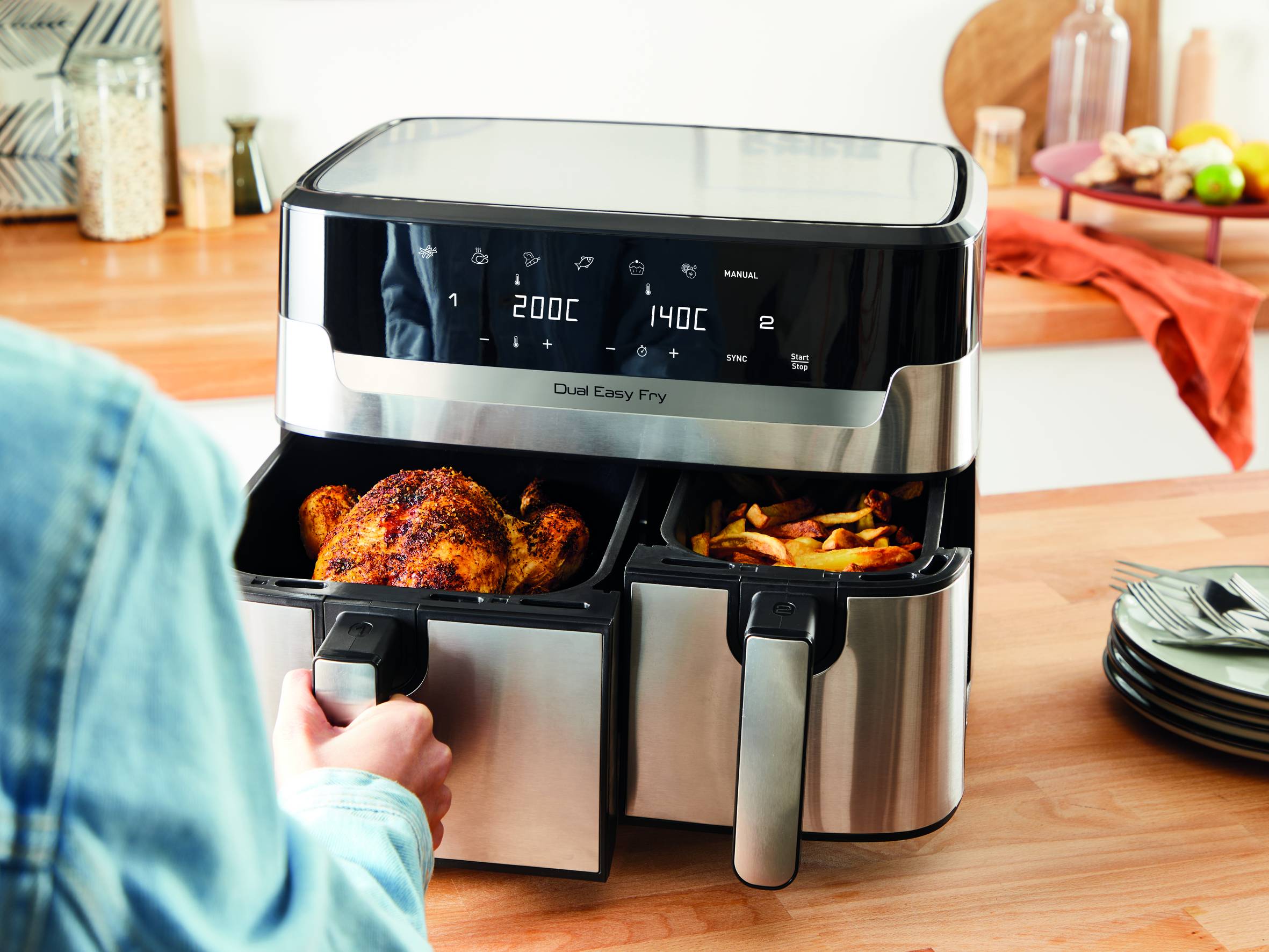 Quando se trata de refeições deliciosas para toda a família, nunca fica comprometido - e nunca mais precisa escolher entre fritar, grelhar ou assar! As duas cubas da fritadeira Dual Easy Fry & Grill significam que pode ter sempre o melhor de dois mundos. Pense em mais tempo com a sua família, e em deliciosa comida caseira. Pense em refeições completas e saudáveis, rápidas e fáceis. Pense nos dois pratos favoritos da sua família prontos ao mesmo tempo! Basta usar a cuba XL para alimentos grandes, como lombos assados ou pizza caseira, a gaveta mais pequena para porções menores ou refeições individuais, ou ambas as gavetas para quantidades verdadeiramente generosas de batatas fritas e outros pratos.