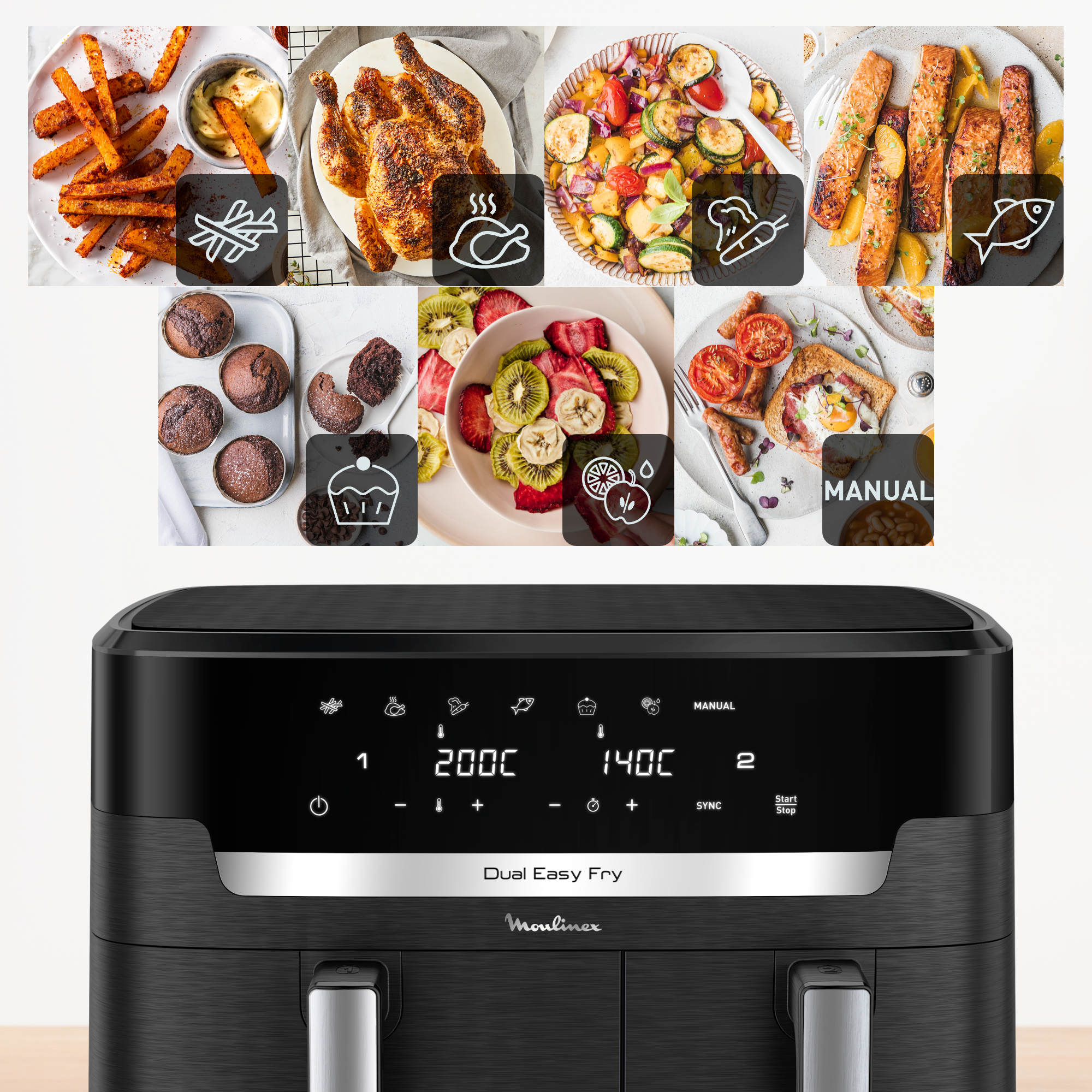 Fritadeira sem óleo dupla XXL para cozinhar dois ingredientes em simultâneo, para uma refeição completa de uma só vez A maior fritadeira sem óleo dupla da Moulinex: capacidade XXL com uma cuba de 6,5 L e outra de 4,5 L — ideal para 8 a 10 pessoas 6 programas automáticos: Batatas fritas, frango, legumes, peixe, sobremesas, desidratação e controlo manual da temperatura (40-200 °C) Desde batatas fritas estaladiças a um salmão de fazer crescer água na boca, prepare uma grande variedade de refeições equilibradas que todos irão adorar Utiliza até 70% menos energia e cozinha até 45% mais rápido do que os fornos tradicionais (testes realizados em 2024 com batatas fritas congeladas) Cuba antiaderente e compatível com a máquina de lavar loiça para uma limpeza fácil e uma experiência de cozedura sem stress Aplicação gratuita para ideias de receitas com base no seu gosto, tempo ou ingredientes disponíveis – e muito mais 15 anos de reparabilidade para ajudar a proteger o ambiente e reduzir o desperdício