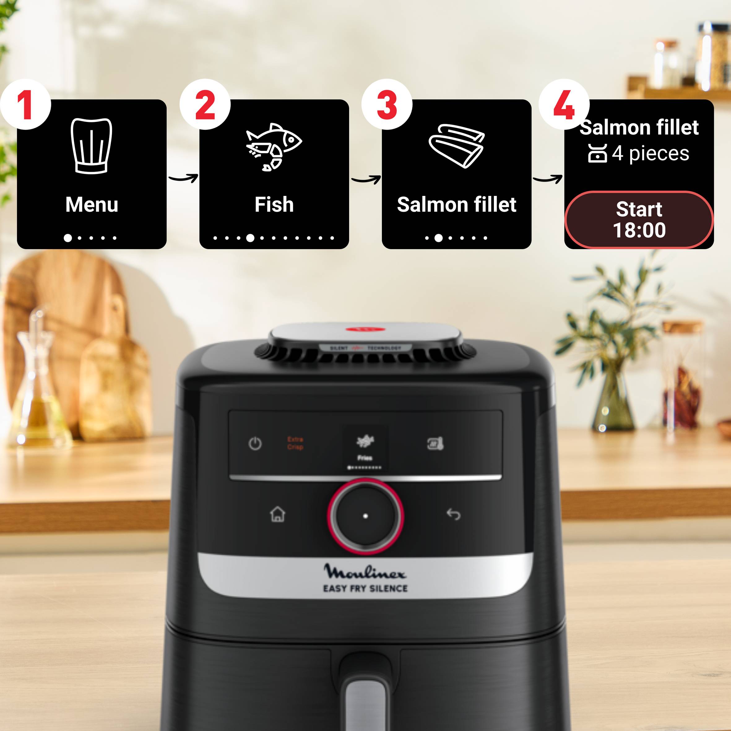 Descubra a Easy Fry Silence, a air fryer mais silenciosa* da Moulinex para resultados perfeitos e ultra-silenciosos. Desfrute de uma experiência culinária livre de stress com o sistema Smart Assist para resultados sempre perfeitos. O painel frontal amovível garante uma limpeza e arrumação sem esforço. A Easy Fry Silence Smart Assist inclui um ecrã tátil intuitivo e poupa até 70% menos de energia do que os fornos tradicionais.**