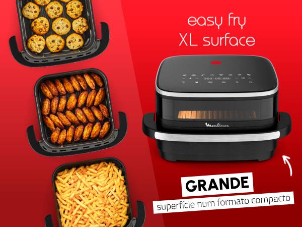 Descubra a Easy Fry XL Surface da Moulinex, uma fritadeira sem óleo grande para uma infinidade de receitas fritas sem óleo, prontas num piscar de olhos: até 1 kg de batatas fritas, 25 nuggets, pizzas até 27 cm e mais! Concebida para alimentar até as famílias mais vorazes, graças à sua cuba XL, a Easy Fry XL Surface foi criada de modo a não ocupar muito espaço na sua bancada. Resultados perfeitos, sem esforço, com a janela de observação para controlar o progresso das suas receitas sem ter de abrir a cuba.