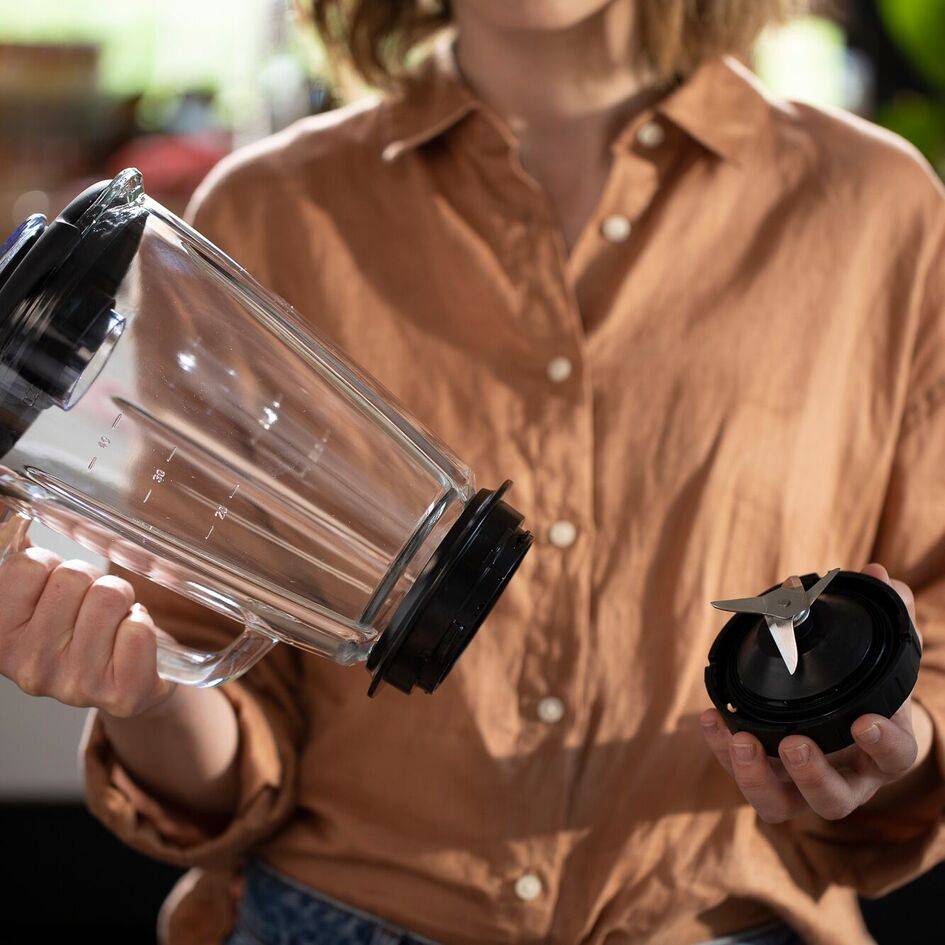 Batidos fáceis de fazer e saborosos ao seu alcance com a liquidificadora Eco Respect! Esta liquidificador de design ecológico permite-lhe preparar todos os tipos de receitas saborosas, quentes ou frias. Com um motor potente de 800 W, assim como 4 lâminas afiadas de aço inoxidável, consiga preparados de forma fácil, rápida e ao seu gosto dia após dia. O botão rotativo com 2 velocidades, para além da função pulse, torna mais fácil obter a textura desejada, enquanto o copo de vidro resistente a choques térmicos permite-lhe misturar ingredientes quentes (até 80 °C) ou até triturar gelo sem se preocupar. O sistema Smart Lock 3 em 1 torna mais fácil e seguro trancar o copo na liquidificadora, mantendo as lâminas presas durante a utilização ou dando-lhe fácil acesso às mesmas no momento de lavar. Graças às quatro ventosas na base, a liquidificadora mantém-se estável independentemente da dureza dos ingredientes.