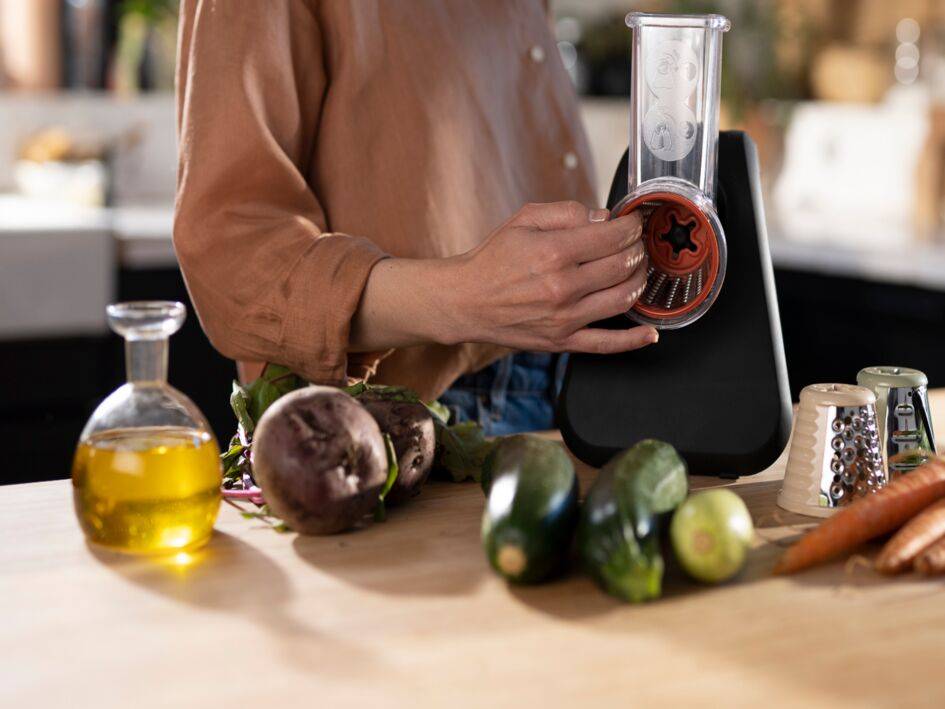 Ralador com design ecológico, feito de plástico reciclado para reduzir o seu impacto ambiental; Fácil de usar: corta, rala e tritura; 3 cones com código de cores ajuda a proporcionar uma grande experiência ao utilizador; Os acessórios podem ser guardados no próprio aparelho para fácil armazenamento; Fabricado em França; Cones facilmente removíveis, um amplo tubo de alimentação para inserir facilmente legumes, e um sistema de serviço directo; Acessórios laváveis na máquina de lavar louça e uma cabeça removível tornam a limpeza sem esforço.