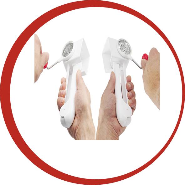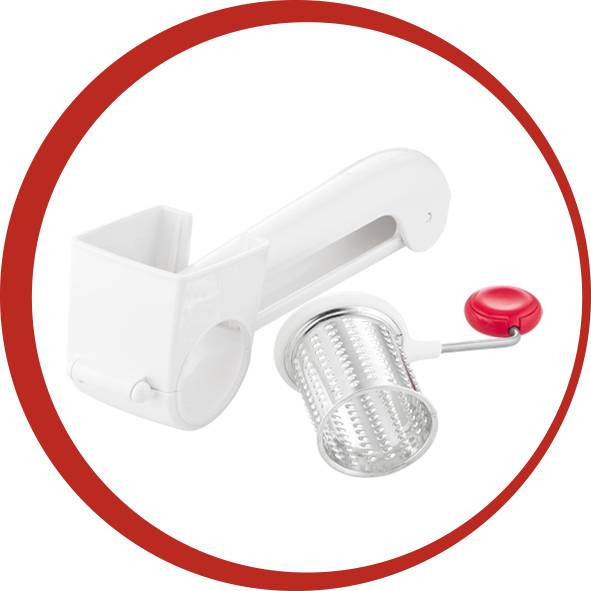 Ralador rotativo com cabo reversível para uso com a mão esquerda e direita. Um formato compatível com a máquina de lavar a loiça para uma limpeza sem esforço. Ralador manual com lâmina em aço inoxidável, para uma utilização duradoura. Rala queijo, chocolate e muito mais de forma rápida e fácil