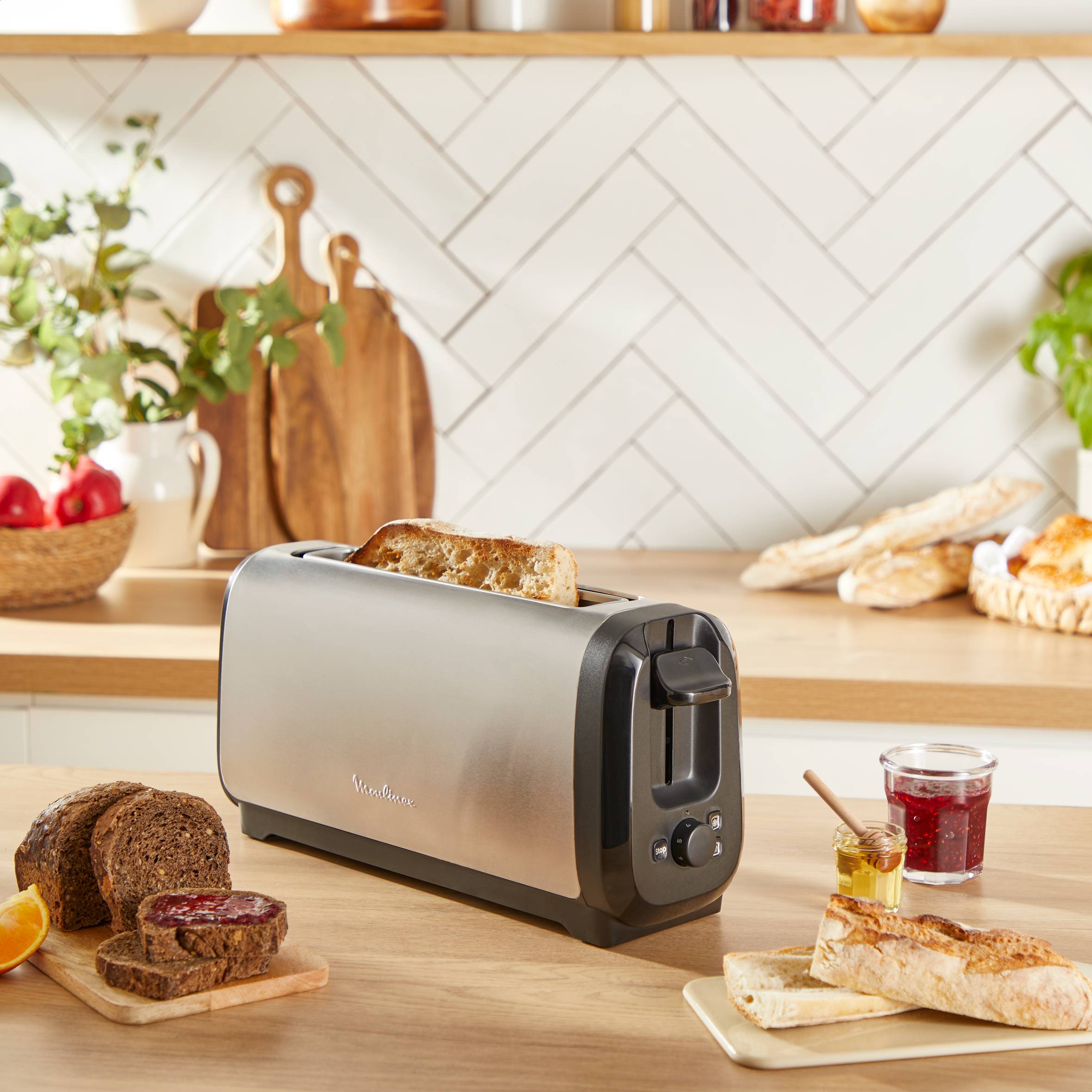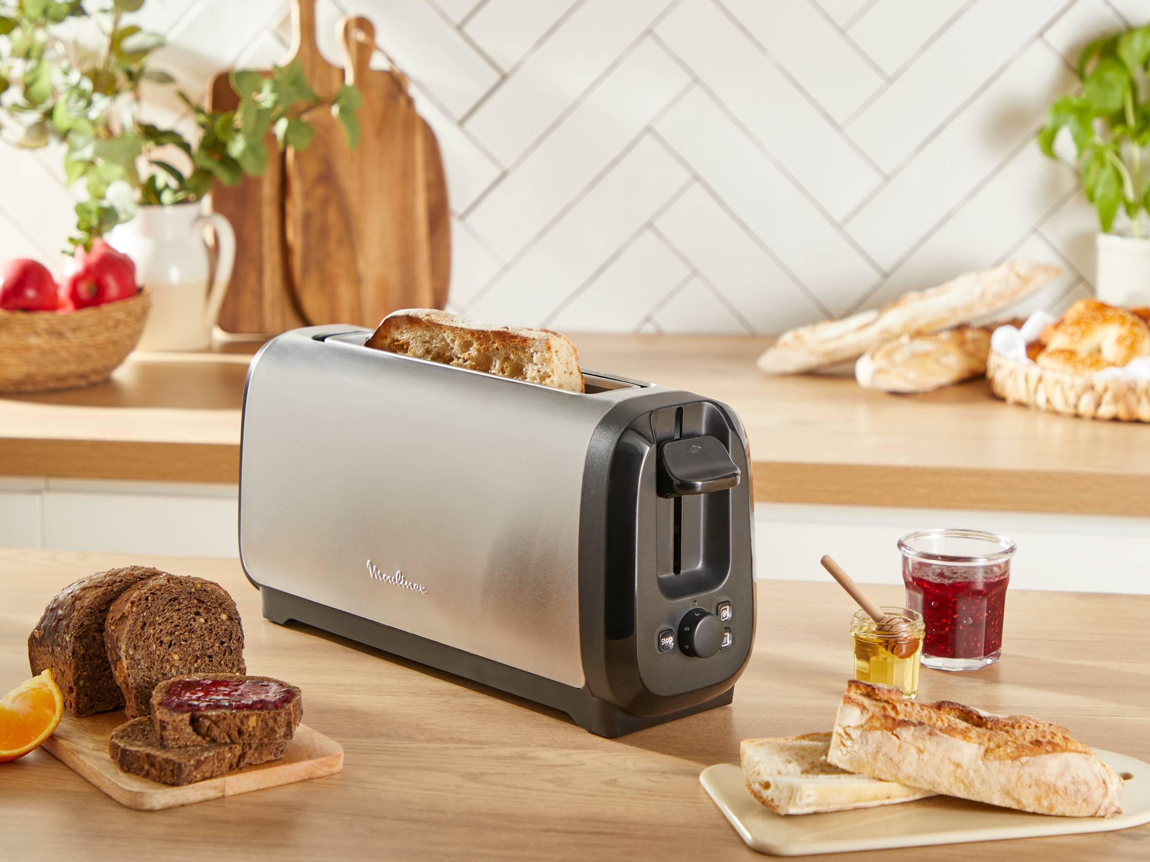 Faça valer cada minuto com a torradeira Subito. Esta torradeira elegante com fenda longa prepara torradas perfeitas até 50% mais rápido e consome até menos 27% de energia (vs Subito LS340 no nível 4). Ideal para manhãs agitadas! Adequada para qualquer tamanho de pão e oferecendo 7 níveis de tostagem, esta torradeira moderna foi concebida com funcionalidades práticas que tornam a tostagem do pão ainda mais fácil, incluindo uma alavanca de elevação extra, funções convenientes (stop, descongelar ou reaquecer) e uma gaveta de recolha de migalhas amovível fácil de limpar.